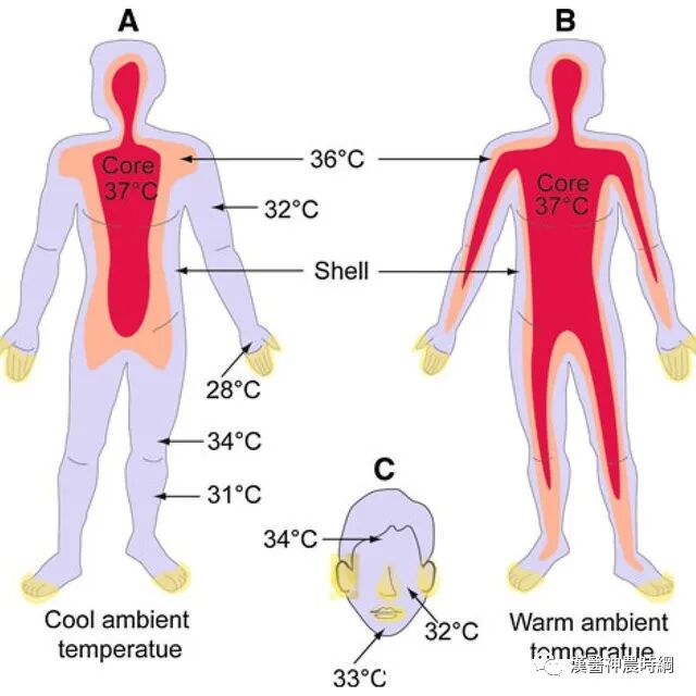 除了体温外,人还有“皮肤温”,也就是皮肤表面的温度。在环境温度为23℃时,人的额部皮肤温一般为33—34℃,手为30℃,脚为27℃。