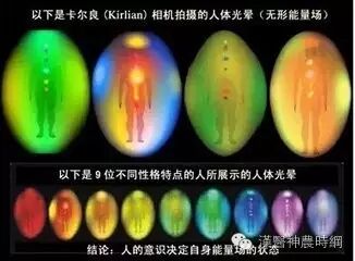 ”事实上,人的个人修养决定了人的不同性格特点,他们的人体光晕的颜色也不相同。据研究发现,一个长期注重个人修养,人体常常处于和谐平衡时的人体光晕与一个欲望高涨的人体光晕颜色差别很大。