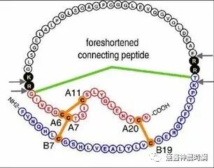 胰岛素在胰岛B细胞中合成。胰岛素合成的控制基因在第11对染色体短臂上。基因正常则生成的胰岛素结构是正常的;若基因突变则生成的胰岛素结构是不正常的,为变异胰岛素。在 B细胞的细胞核中,第11对染色体短臂上胰岛素基因区DNA向mRNA转录,mRNA从细胞核移向细胞浆的内质网,转译成氨基酸相连的长肽--前胰岛素原,前胰岛素原经过蛋白水解作用除其前肽,生成胰岛素原。