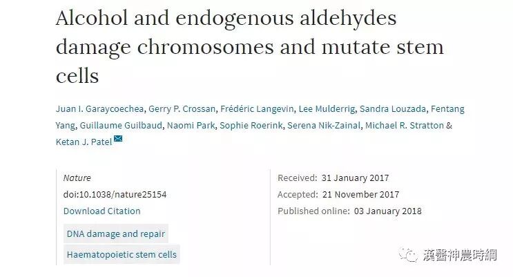 2018年1月3日,发表于杂志《自然》上的论文表明喝酒有致癌性 | 《自然》官网截图