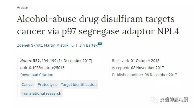 2017年12月6日,发表于杂志《自然》上的论文表明戒酒药双硫仑可抗癌 | 《自然》官网截图