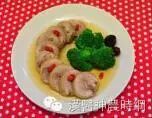 电锅置蒸架,外锅放一杯水,将卷好的鸡腿肉置于盘上放入电锅蒸。