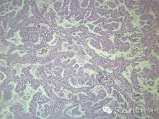 腺癌这种类型和吸烟关系最小,占肺原发肿瘤的40%。常位于肺的周边部,还累及胸膜并形成相关的疤痕圈和胸腔积液。周围型腺癌发生在和结核或梗死或其他损害相关的疤痕区的理论已经有很长时间了。疤痕癌的概念提示癌前病变上皮在疤痕区发生改变引起癌。然而一些研究者则提出疤痕继发于癌。