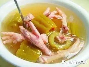 材料:苦瓜1根,姜2片,鸡脚6只,瘦肉200克,盐适量。