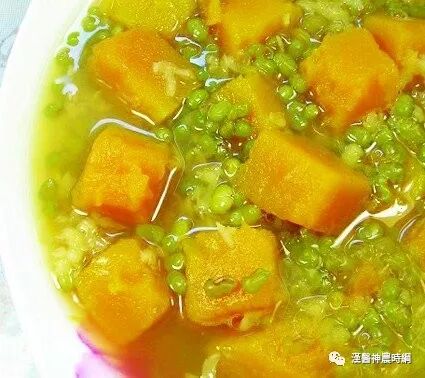绿豆洗净后用水泡半个小时,锅中加入适量水,绿豆沥干水分后倒入锅内,南瓜切块,绿豆煮到开花倒入切好的南瓜块中火煮,煮到南瓜变软即可。