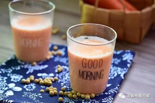 2.将胡萝卜和泡好的黄豆洗净,混合放入豆浆机杯体中,加水至上下水位间,接通电源,按“五谷豆浆”键,十几分钟后即做好胡萝卜豆浆。