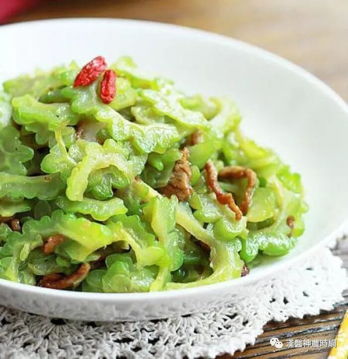明代以前医书没有记载苦瓜,明代《救荒本草》、《本草纲目》始列入,疑为三宝太监下西洋时,从南洋群岛移植过来。清代王孟英的《随息居饮食谱》说:”苦瓜清则苦寒;涤热,明目,清心。可酱可腌。中寒者(寒底)勿食。熟则色赤,味甘性平,养血滋肝,润脾补肾。” 即是说瓜熟色赤,苦味减,寒性降低,滋养作用显出,与末熟时相对而言,以清为补之。其实吃苦瓜以色青末黄熟时才好吃,更取其清热消暑功效。