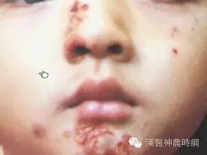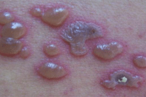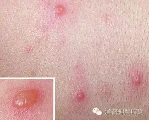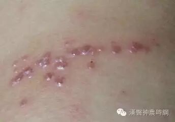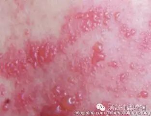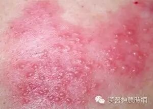 发病前局部皮肤先有灼痛,伴轻度发热、疲倦无力等全身症状。但也可以无前驱症状,经1~3天后,皮肤陆续出现散在红斑。继而在红斑上发生多数成簇的粟粒大至绿豆大小的丘疱疹,并迅速变为水疱。水疱壁紧张,光亮,疱水澄清,水疱表面大部有小凹陷。数日后疱液混浊化脓,破溃后形成糜烂面,最后干燥结痂,痂脱落后留下暂时性红斑。