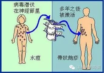 在少数情况下,疱疹病毒可散布到脊髓前角细胞及内脏神经纤维,引起运动性神经麻痹,如眼、面神经麻痹以及胃肠道和泌尿道的症状.现认为初次发生水痘后, 只产生一种不完全性免疫反应,当发生带状疱疹时机体内部出现完全免疫反应,故发生带状疱疹后,一般不会复发。