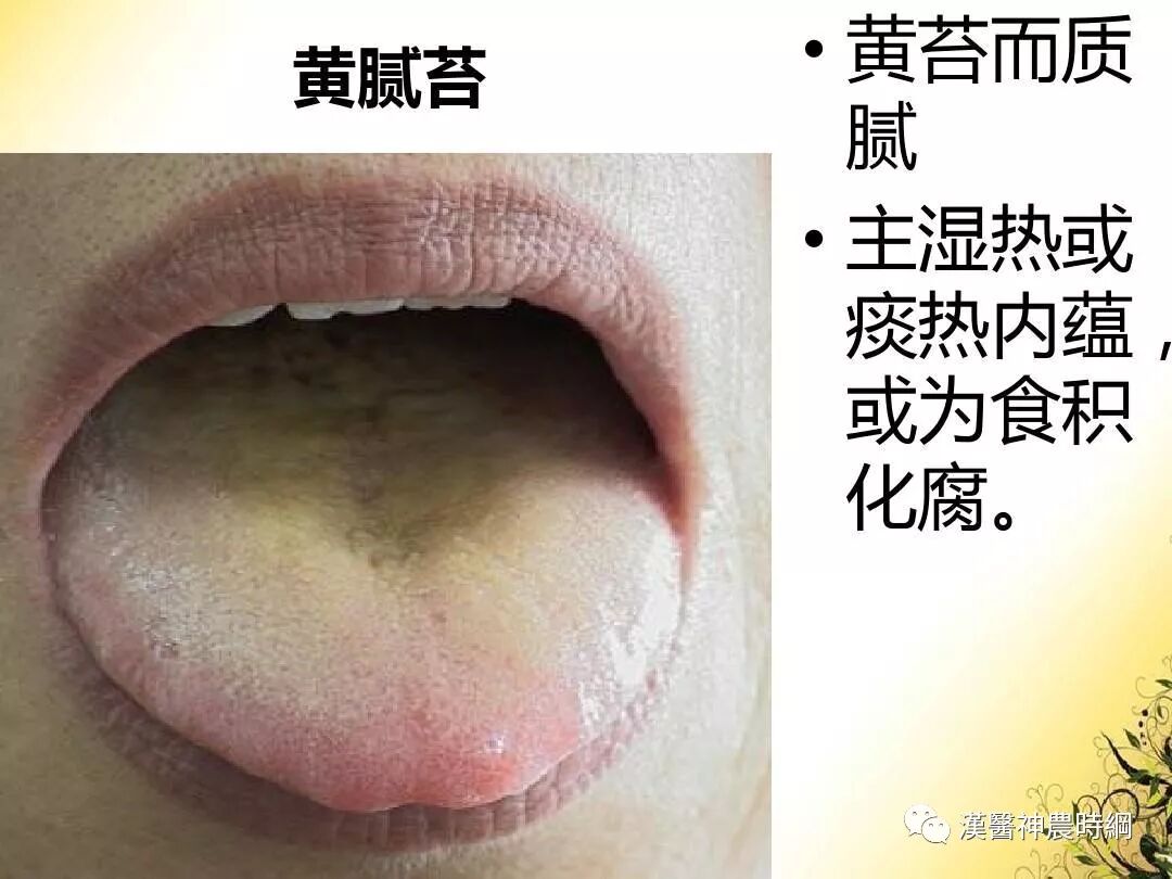 黄苔主要是里证或热证。苔色越黄,反映热邪越重,淡黄为热轻,深黄为热重,焦黄为热结(指热邪聚结而出现的病变)。此外,阳虚寒湿,或痰饮食积停滞过久,郁久则化热,也会出现黄苔。