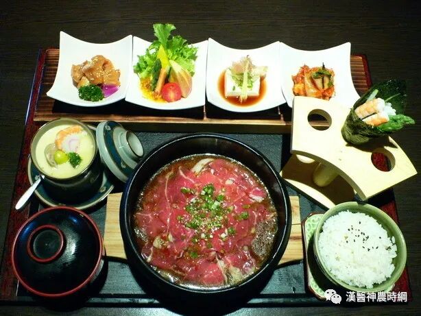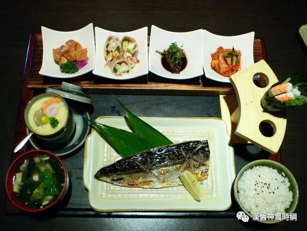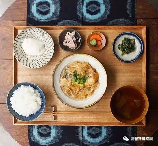 米饭,咸菜放在左边,酱汤放在右边,筷子放在中下方,这种摆法是不变的,只是配菜要放在空隙处。和定食内必须有米饭菜,咸菜,酱汤或清汤,其他菜可根据价格调配。