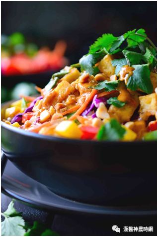 温水/120~175ml、酱油/3汤匙、红糖/1汤匙、老豆腐/150g、玉米淀粉、胡萝卜、紫甘蓝、樱桃番茄、煮青豆、小芒果、香菜、碎花生