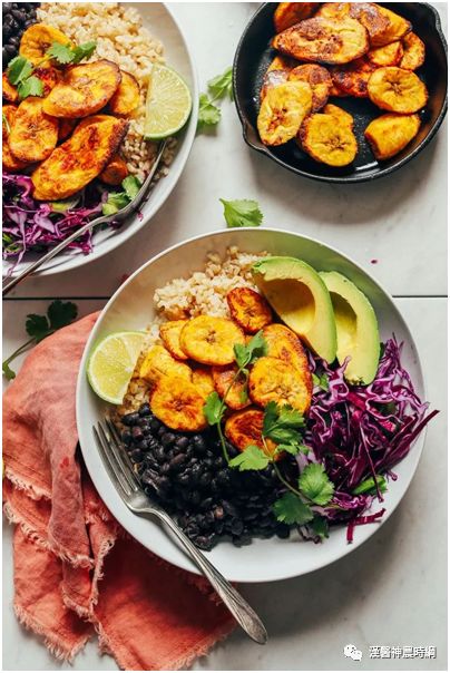 这个碗的底部是米饭和豆子,但在我看来,真正的主角是烤香蕉,在椰子油和海盐中搅拌,在高温下烘烤至完美,外面酥脆,里面软嫩。