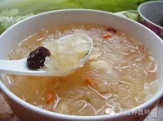 银耳粥 原料:银耳10克,粳米150克,白糖20克。 制作:将银耳用温水发胀,除去蒂头、杂质;粳米淘洗干净。将粳米、银耳放入铝锅内,加水600毫升,置武火上烧沸,再用文火炖煮35分钟,加入白糖即成。每日1次,早餐食用。 功效:清肺热,益脾胃,美容颜。适用于阴虚咳嗽之更年期综合症。
