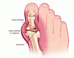 2、急性高尿酸性关节炎:四季均可发病,以春、秋季最多。关节局部损伤、饱餐暴饮、过度疲劳、受湿冷、某些药物、感染及外科手术等均可诱发急性发作。这些因素可使本已呈过饱和状态的尿酸形成针状结晶沉积在关节滑液中,结晶体被体内白细胞视为异己而被吞噬,被吞噬后释放炎性因子,引起急性发作。