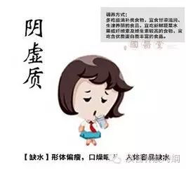 如果一个人怕热,经常感到手脚心发热,面颊潮红或偏红,皮肤干燥,口干舌燥,容易失眠,经常大便干结,那就是阴虚。他们大部分都是性格比较外向好动的,性情是比较急躁的。多吃甘凉滋润的食物,比如瘦猪肉、鸭肉、龟、鳖、绿豆、冬瓜、芝麻、百合等。少食羊肉、狗肉、韭菜、辣椒、葱、蒜、葵花子等性温燥烈的食物。中午保持一定的午休时间。避免熬夜、剧烈运动和在高温酷暑下工作。宜节制房事,因为我们有些房事活动伤精耗液,对男女都一样。只适合做中小强度、间断性的身体锻炼,可选择太极拳、太极剑等。锻炼时要控制出汗量,及时补充水分。不适合洗桑拿。平时宜克制情绪,遇事要冷静,正确对待顺境和逆境。可以用练书法、下棋来怡情悦性,用旅游来寄情山水、陶冶情操。平时多听一些曲调舒缓、轻柔、抒情的音乐,防止恼怒。