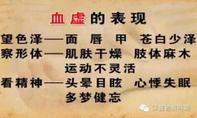 肝血虚:看东西时两眼昏花、干涩,指甲无光泽、色淡、脆而薄,甚至变形,夜盲,看东西模糊,耳鸣,手脚肢体麻木,体形消瘦,女性月经量少,色淡,甚至闭经,失眠多梦,易惊醒。