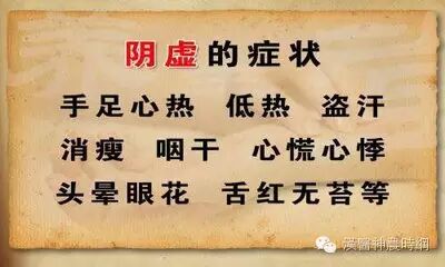 症状:阴虚的人体形瘦长,面色潮红、有烘热感,手足心热,眼睛干涩,视物昏花,唇红微干,易口噪咽干,喜冷饮,皮肤偏干,眩晕耳鸣,睡眠差,小便短涩,大便干燥等症状。