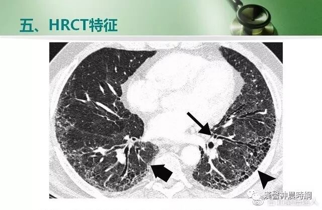 一般情况下,肺纤维化早期出现肺泡炎,肺泡内有浆液和细胞成分,肺间质内有大量单核细胞,部分淋巴细胞,浆细胞,肺泡巨噬细胞等炎性细胞浸润,肺泡结构完整。进入晚期,慢性炎症已减轻,肺泡结构为坚实的胶原代替,肺泡壁被破坏,形成扩张的蜂窝肺。胶原、细胞外基质、成纤维细胞分布在间质中,肺泡上皮化生为鳞状上皮。基于以上病理变化,临床上多表现为进行性呼吸困难或伴有刺激性干咳,胸部X线显示两中下肺野网状阴影,肺功能为限制性通气功能障碍。病情呈持续性进展,最终因呼吸衰竭而死亡。