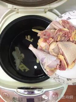4.把鸡块,泡过的黄芪,当归,红枣,放入一勺盐,放锅里加水和食材一样高,鸡里面还有鸡油,水不要放多了,我用的是电高压锅煲汤25分钟即可