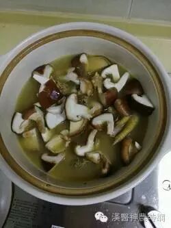 6.香菇加入后,又炖了将近1小时,打开锅盖香味扑鼻,这个时候鸡汤基本已经完成,加入少许盐,就可以出锅开动了。