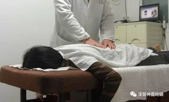 8.按腰部,用掌心按压腰部,腰部由下至上划膀胱筋,划至臀部,双手握拳,用手背按压腰部,然后弹出.