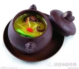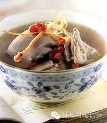 方药及用法:发海参96克,西洋参10克(另包,只炖15分钟),猪脊骨250克,淮山65克,盐、花生油适量。先将发海参切成小块,与斩块的猪脊骨放入大炖盅,放入淮山、水适量,水开后用文火炖1小时,然后放入西洋参片和杞子、生油和盐再炖15分钟即成。分数次喝汤,吃海参。