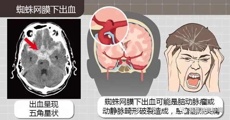 2.诊断 诊断依靠头部外伤史、腰椎穿刺硷查、影像学检查(计算机断层扫面、MRI、动脉造影)。