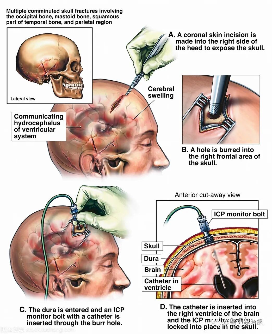 3.治疗 抗生素、镇痛剂、抗惊厥及渗透性利尿剂治疗。必要时行手术治疗,如肿瘤扩散时应行化疗及放疗。