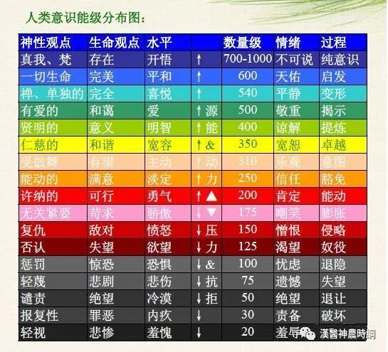 经过科学家的大量试验,得出了如下图所示的《人类意识能级分布图》,这幅图也就是浩然近几个月来,为大家讲解的人体能量层级,其中不同颜色光晕代表的不同情绪以及意识能量水平。