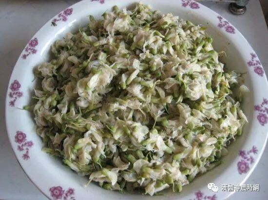 把槐花放进开水里过一遍,再用油炒,加入一点盐和醋,倒进碟子里,象一盘碎玉,不仅赏心悦目,而且色香味俱佳,让人胃口大开。