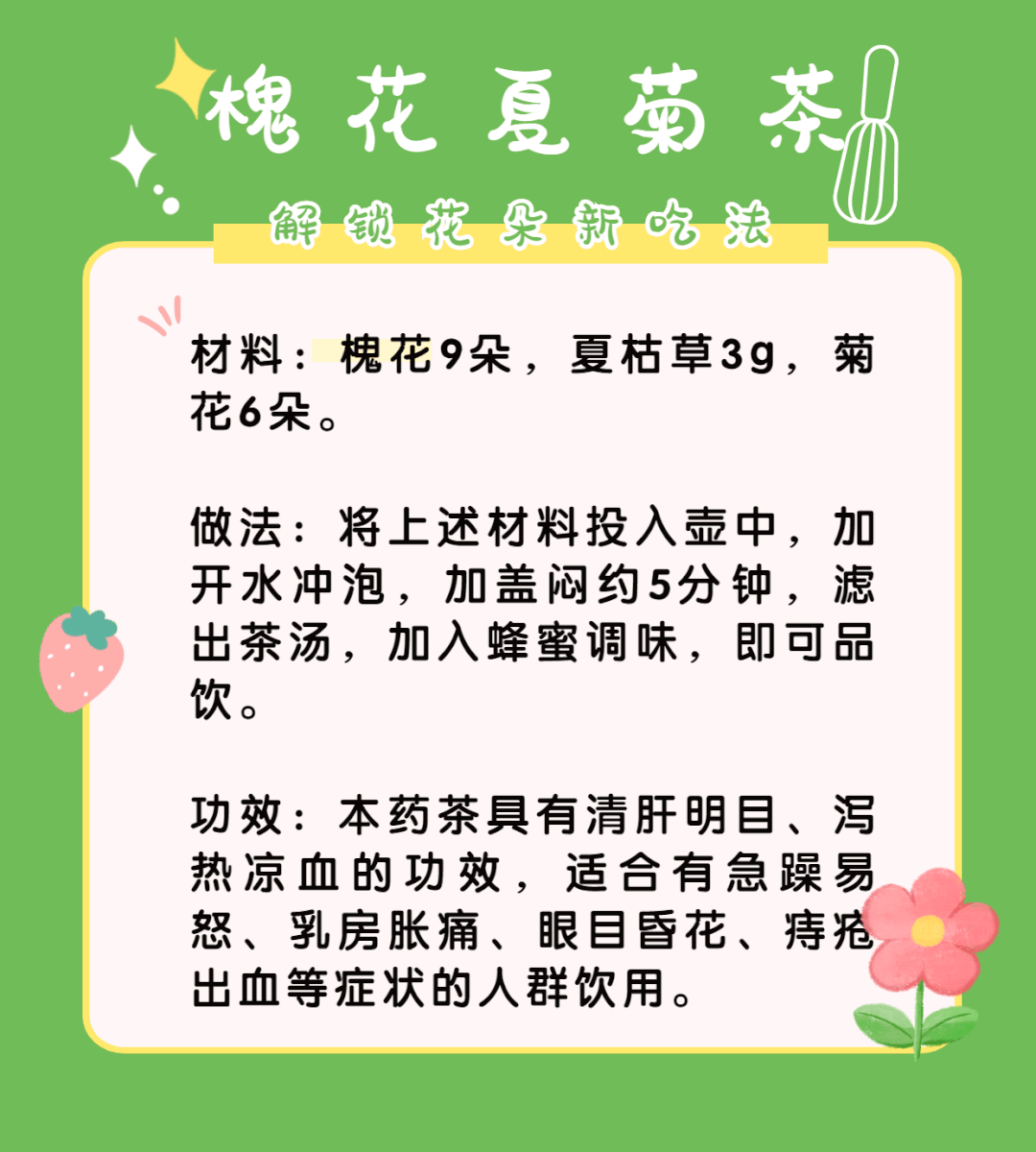 槐花还可以用于肝火上炎之头痛头胀、目赤、眩晕等。现代临床亦常用于高血压属肝火偏旺者,有清肝明目降压之功。可单用煎汤代茶,或配夏枯草、菊花等同用。