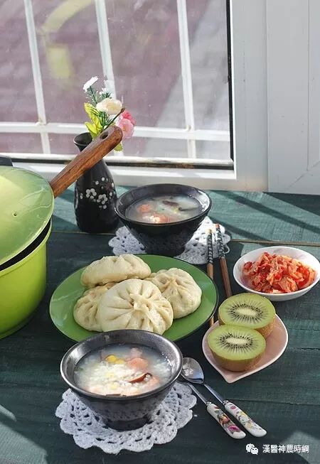 11、提前包好的白菜粉条馅包子,鲜虾滑玉米粥,辣白菜,还有水果猕猴桃!