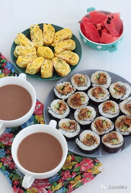 2、周末有时间用照烧鸡肉做的寿司卷,还做了厚蛋烧(香葱蛋卷饼)和奶茶 ,算是早午餐了