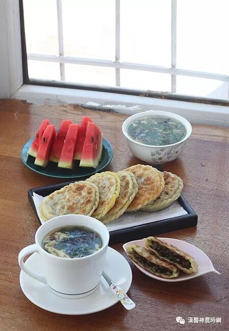 9、晚上用豆角肉末和橄榄菜做好馅,做好烫面团,冷藏保存,早晨起来做的榄菜豆角馅饼,煮了菠菜鸡蛋汤,水果是西瓜!