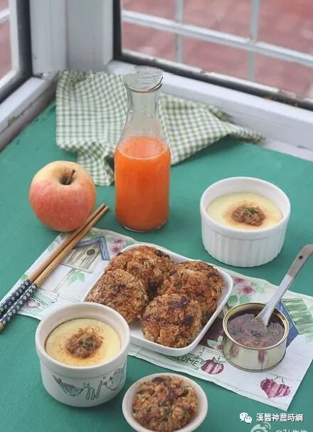 20、蒸了鸡蛋羹,将昨天做肉夹馍剩的酱肉取出一小块切成末放点酱肉汤和葱花煮开用少许淀粉勾芡做成汁浇在蛋羹上;剩米饭蒸锅热透放入葱末、胡萝卜末、黄瓜末、再放入自制肉松和拌饭酱 拌匀后用保鲜膜做成团再轻轻一压就成了酱香米饼;果汁是苹果胡萝卜汁放了一些纯净水和蜂蜜!