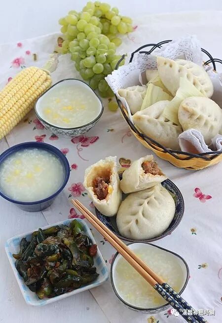 16、玉米鲜肉包、玉米大米粥、油黄瓜小菜,葡萄,肉包和小咸菜。