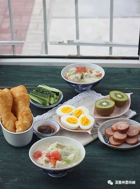 1、馄饨皮包馄饨;煮蛋,切了黄瓜蘸香其酱;散步的时候买的香肠,还有油条!