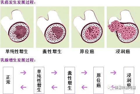 囊性增生病与乳腺癌的关系尚不明确,流行病学研究提示囊性增生病患者以后发生乳腺癌的机会为正常人群的2~4倍,囊性增生病本身是否会恶变与其导管上皮增生程度有关,单纯性的囊性增生病很少有恶变,如果伴有上皮不典型增生,特别是重度者,则恶变的可能较大,属于癌前期病变。