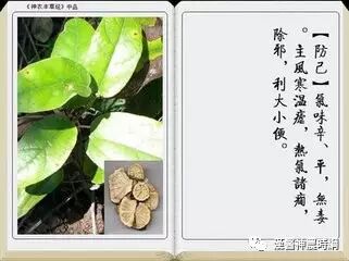 防己气寒,风湿脚痛,热积膀胱,消痈散肿。