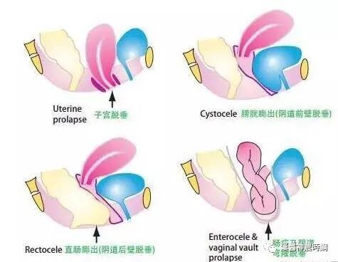 其中有阴道前后壁的膨出,也就是膀胱和直肠的膨出以及子宫脱垂,这几种情况可以单独存在,也会合并发生,大家比较熟悉的就是子宫脱垂,盆腔器官脱垂主要的症状就是外阴部有块状物脱出,有些还伴有排尿,排便的异常,下坠感 腰酸等症状,还有些患者,由于长期的脱出物摩擦,会导致出血 炎症,很大程度的影响了患者的生活质量,轻症的患者可能没有症状.