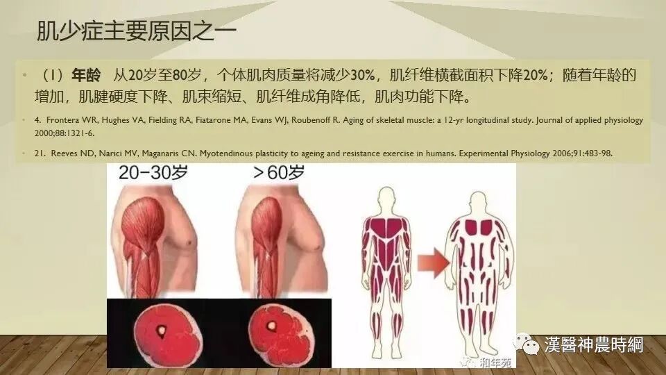 在人体从成熟到衰老过程中,神经肌肉系统的机能和表现显著下降,其特征就是即使是健康的老年人也会不可避免地发生骨骼肌质量下降及肌力减退。最常见的诱因为老化、肿瘤、营养不良,其中以老化最为重要。老化过程中及体力活动减少导致肌肉块丢失。