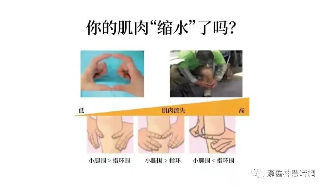 3.肌肉量变少,可用手的虎口围小腿肚,小腿肚很壮则肌少症风险小,若是有空间就要注意肌少症风险高。