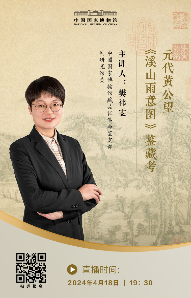 现藏于中国国家博物馆的《溪山雨意图》,是元代画家黄公望早期重要代表作品,画作体现了黄氏画风及师承,上有多处题跋及多方收藏印。本课程将从释读画卷的题跋、钤印、著录等入手,梳理画作的创作、流传及收藏过程。通过比对真迹与摹本画法,揭示黄公望真迹时代及个人风格,阐述其文物价值,再现画卷背后的人文景观。