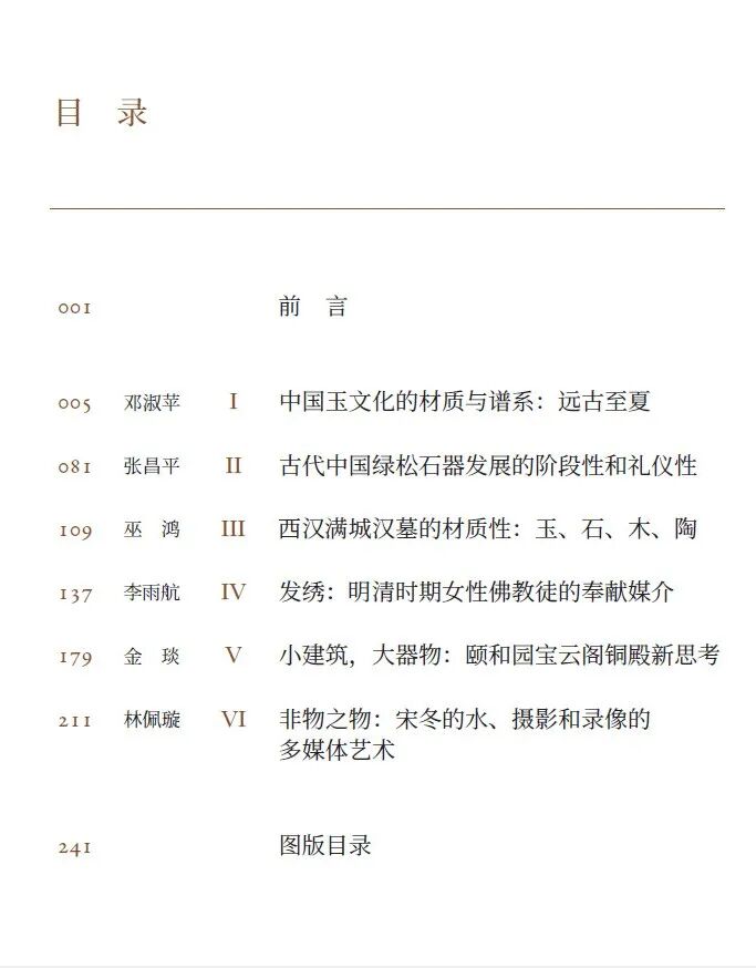 书中涵盖对早期玉器的原料和渊源的详尽分析;三代时期对绿松石这种特殊材料的开发和运用;西汉满城汉墓中对不同物质的选择及其象征意义;“发绣”这种特殊艺术形式的种类、来历及功能;对一座清代纯铜建筑物的专题讨论;以及当代艺术家以“水”为材料进行的艺术实验。