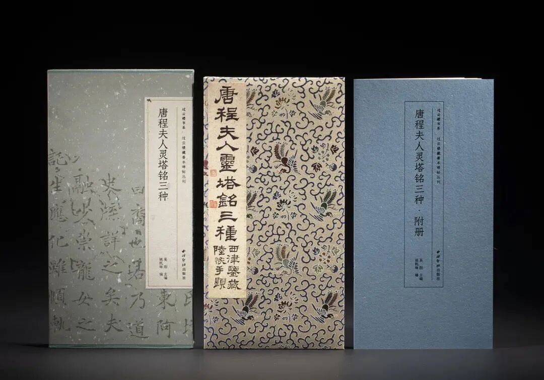 《唐程夫人灵塔铭三种》为“过云楼书系·过云楼藏善本碑帖丛刊”系列之一。全册共八开,收录3个不同版本。册首两开为两幅画,一为过云楼第三代主人顾麟士所绘《读碑图》,一为陆恢所绘《程夫人灵塔图》;割裱本两个,前者2开为原刻本,后者2开为翻刻本,边上有顾麟士墨跋;另有整幅本一纸,亦为原刻本。《程夫人灵塔铭》有翻刻本数种,原石拓本稀见。此册虽小,却可据此一窥过云楼所藏碑帖之一斑,也是学习初唐楷书的临池善本。