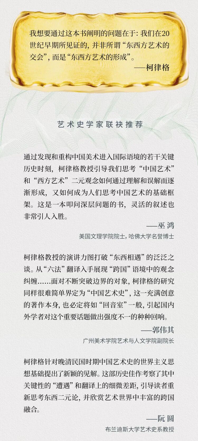 以谢赫“六法”中“气韵生动”的跨国传播为起点,通过探讨这一时期围绕中国绘画建立的“回音室”,讲述“中国画论”如何在传播、转译乃至误译与误读中形成,进而阐明了这样一种观点:我们在20世纪早期所见证的,并非所谓“东西方艺术的交会”,而是“东西方艺术的形成”。