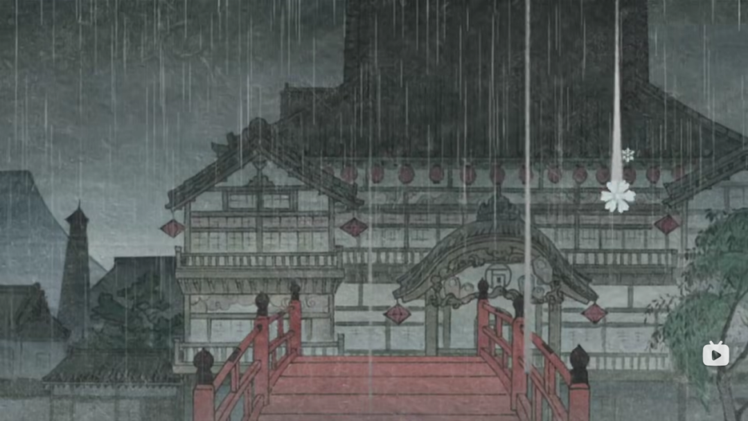 动画中漫符的手法很常见。漫符通过现实中不存在的、高度抽象的符号来刻画人物,揭露人物内心世界。去年(2022年)的热门动画孤独摇滚中随处可见这类手法。怪化猫虽然几乎没有使用常见的漫符,但这种思路在影片中得到了运用。不是使用透视法式的技法去接近人眼看到的事物,而是使用高度抽象的符号去指代它们,用这种方式去揭示潜藏的东西,去达成效果。更进一步的,恕笔者才疏学浅无法进行下去。怪化猫中随处可以这种高度抽象的符号表达,比如说下图中的雪花,使用固定的符号去指代实际各不相同的雪花,刻意的让雪花沿着垂直水平面的方向落下。