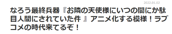 对于《关于我在无意间被隔壁的天使变成废柴这件事》(以下简称《邻家天使》)动画化的宣传,日方用了如下标题。