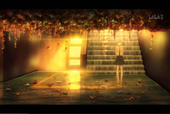 小侑后面的是藤萝花,花语:不被祝福的爱情。虽然头上是象征着不被祝福的藤萝,但脚下是象征着朋友美好祝福的千纸鹤,盘旋的楼梯就像是在·引导人们走向天堂的天之梯,我个人感觉侑暗喻着天使。即使身边是黑暗,可唯独侑被光芒所照耀。